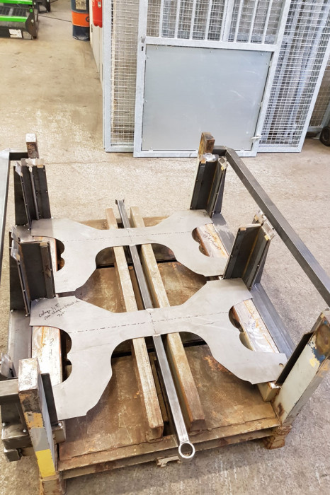 Palette spécifique pour conditionnement et manutention flancs dans atelier d’emboutissage.